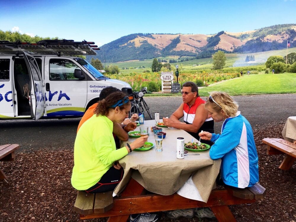 Mount Hood and the Hood River Valley – Begin your day with a challenging ride to a remote alpine lake or save some energy for the rest of the day’s activities by getting a lift in the van to the lake, where you will enjoy a lovely hike which offers spectacular views Mount Hood, Oregon’s highest peak at 11,239’. You might also opt to paddle a canoe in the crystal-clear waters before your tour leaders host a delicious picnic lunch overlooking the lake and Mount Hood. Coast your way downhill from this alpine oasis into the patchwork farmland of the Hood River Valley. Visit a historic farm with amazing orchards that produce refreshing pear wines and hard ciders, not to mention fields of flowers, scrumptious fresh fruit, and spectacular mountain views. Ride through pear and apple orchards along the valley’s gently rolling roads. Following a return to the hotel, browse the shops in Hood River and seek out a restaurant for dinner this evening. Beautiful, friendly, and funky Hood River has frequently been named one of the top US towns for outdoor enthusiasts.